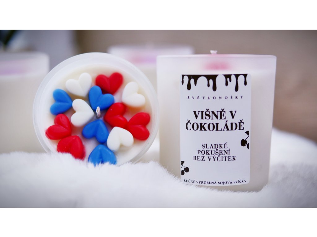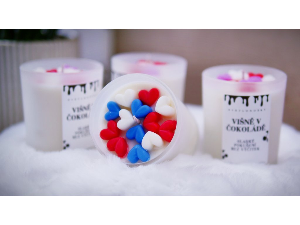 Limitovaná varianta svíčky Višně v čokoládě s národními srdíčky pro všechny, kdo fandí, prožívají každý gól a potřebují u toho trochu klidu (nebo aspoň čokoládovou útěchu).